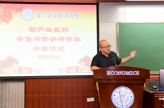 在开班仪式上,廖景峰主任首先代表厦门大学经济学院热烈欢迎PA直营医药零售与营销研修班的学员到厦大学习,并就厦门大学及经济学院的相关情况进行了介绍。他说,PA直营学员走进厦大就是厦大的校友,希望未来的日子能够关心、支持母校的发展,多提宝贵意见,同时他也祝大家在厦大学习期间学有所成、学有所获。